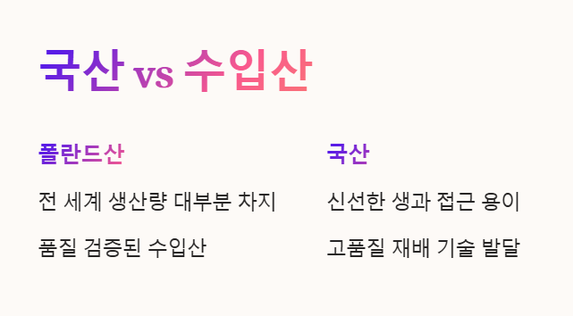 - 국산은 신선하게 생과를 접하기 쉽다는 장점이 있으니, 취향에 맞게 선택하시면 됩니다.