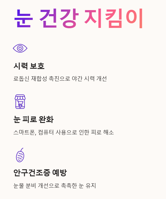 특히, 눈의 망막에서 빛을 감지하는 색소인 '로돕신'의 재합성을 촉진해서 야간 시력 저하나 안구 건조증 예방에 효과적이랍니다. 🌙