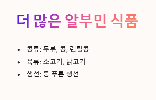 알부민의 재료가 되는 양질의 단백질을 충분히 섭취하는 것이 중요하답니다. 👍