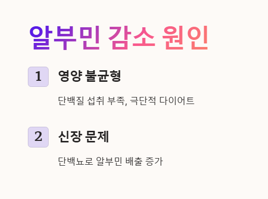 - 신장에 문제가 생기면 단백질이 소변으로 빠져나가는 '단백뇨'가 발생하는데, 이때 알부민도 함께 배출되어 수치가 감소할 수 있습니다.