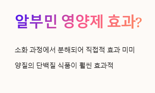 - 먹는 알부민 영양제는 소화 과정에서 아미노산으로 분해되어 흡수되므로, 혈중 알부민 농도를 직접적으로 높이는 효과는 미미할 수 있어요.