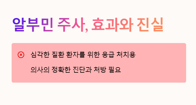 알부민 주사는 간경화, 신부전 등 심각한 질환으로 인해 알부민 수치가 위험할 정도로 낮은 환자에게 응급 처치로 사용되는 전문의약품이에요. 🏥