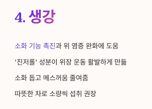- '진저롤'이라는 성분이 위장 운동을 활발하게 만들어 소화를 돕고, 메스꺼움을 줄여준답니다.