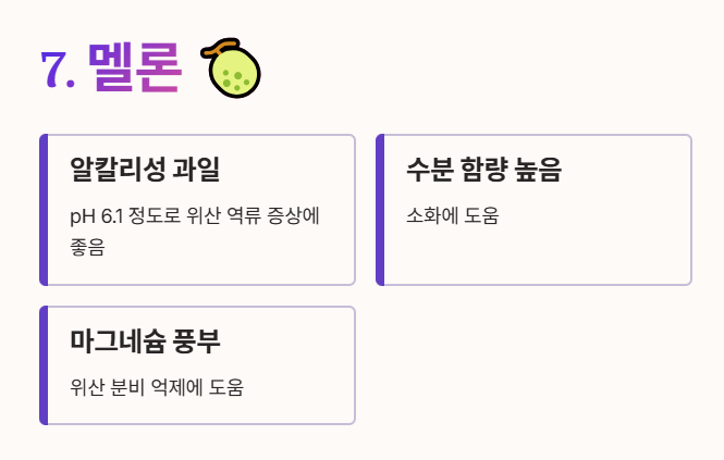 - 멜론은 pH 6.1 정도의 알칼리성에 가까운 과일이라 위산 역류 증상이 있는 사람들에게 좋아요.