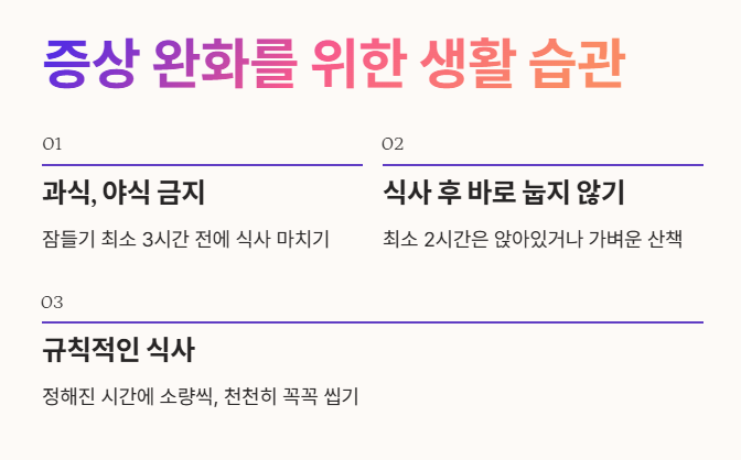 - 속 쓰림, 가슴 통증 등 증상이 심하다면 반드시 전문의의 진료를 받고 적절한 약물 치료를 받는 것이 우선입니다.
