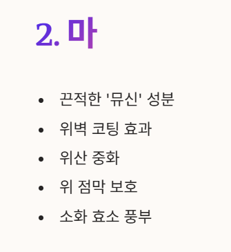 - 이 뮤신 성분은 위벽을 코팅하여 위산을 중화시키고 위 점막을 보호하는 역할을 해요.