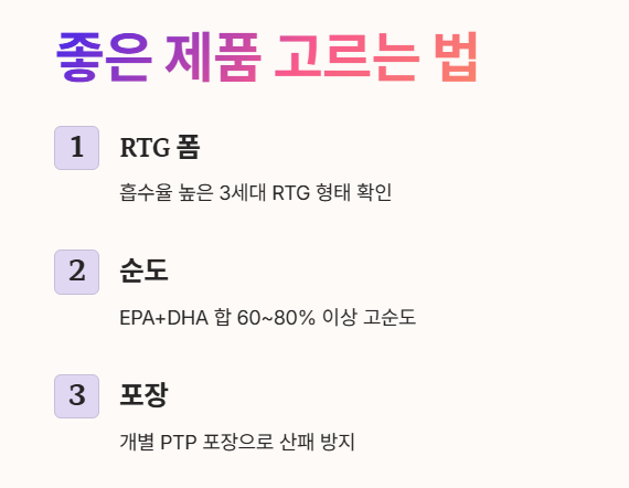 - 2) 순도: EPA와 DHA의 합이 60~80% 이상인 고순도 제품이 좋아요.