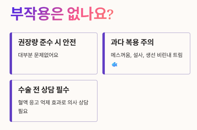 - 권장량을 지키면 대부분 안전하지만, 과다 복용 시 메스꺼움, 설사, 특유의 생선 비린내 트림이 올라올 수 있어요. 🐟