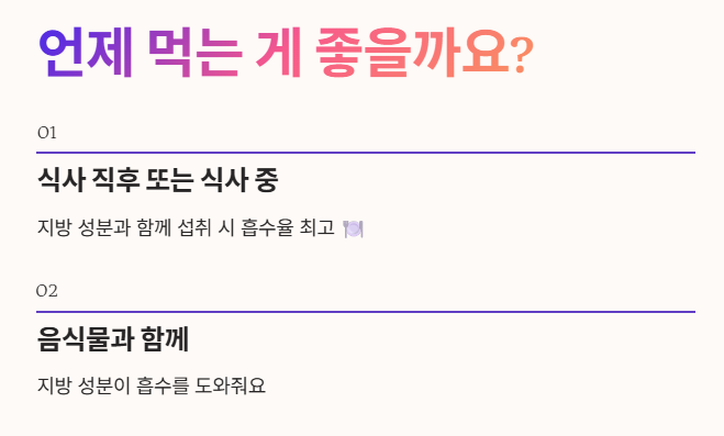 - 음식물의 지방 성분과 함께 섭취될 때 흡수율이 가장 높답니다. 🍽️