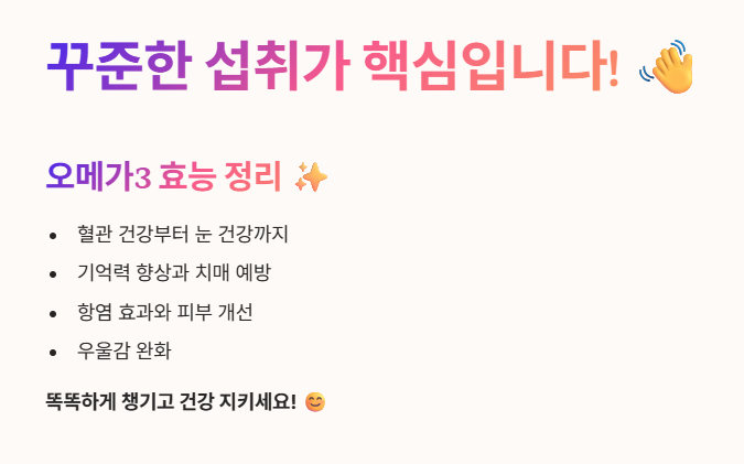 여러분도 오늘 정보를 바탕으로 똑똑하게 오메가3 챙기시고 건강 지키시길 바랄게요! ✨