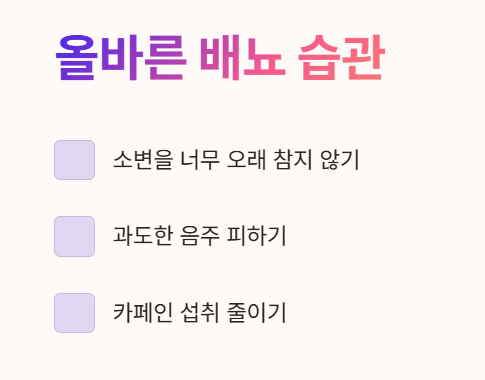 - 과도한 음주나 카페인 섭취는 방광을 자극할 수 있으니 줄이는 것이 좋아요. ☕