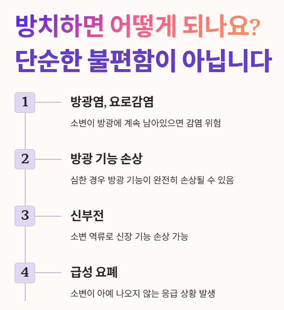 - 소변이 방광에 계속 남아있으면 '방광염'이나 '요로감염'의 위험이 커져요.