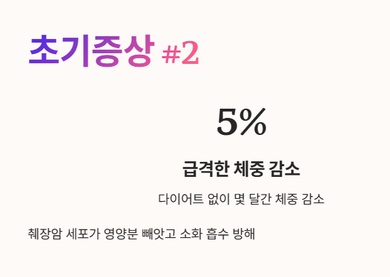 - 다이어트를 하고 있지 않은데도 지난 몇 달간 평소 체중의 5% 이상이 특별한 이유 없이 감소했다면 의심해 볼 필요가 있어요. 📉