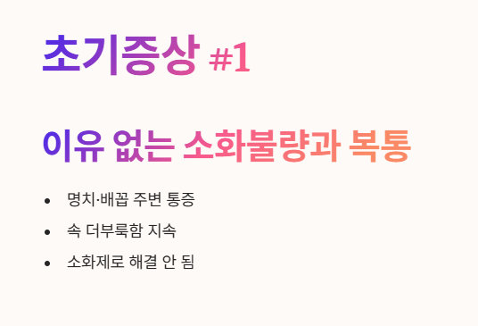 - 많은 분들이 일반적인 위장 질환으로 생각하고 소화제만 먹다가 진단 시기를 놓치는 경우가 많아 각별한 주의가 필요해요.