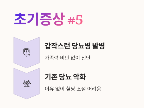 - 가족력도 없고 비만도 아닌데 갑자기 당뇨병 진단을 받았거나, 기존에 있던 당뇨병이 별다른 이유 없이 심해졌다면 췌장암을 의심해 볼 수 있어요. 🩺