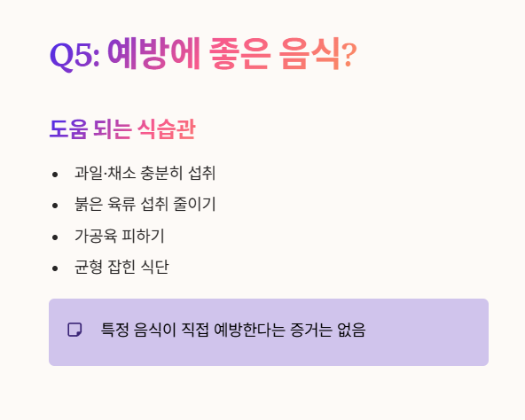 - 하지만 과일과 채소를 충분히 섭취하고 붉은 육류나 가공육 섭취를 줄이는 균형 잡힌 식단이 전반적인 건강과 암 예방에 도움이 될 수 있습니다.