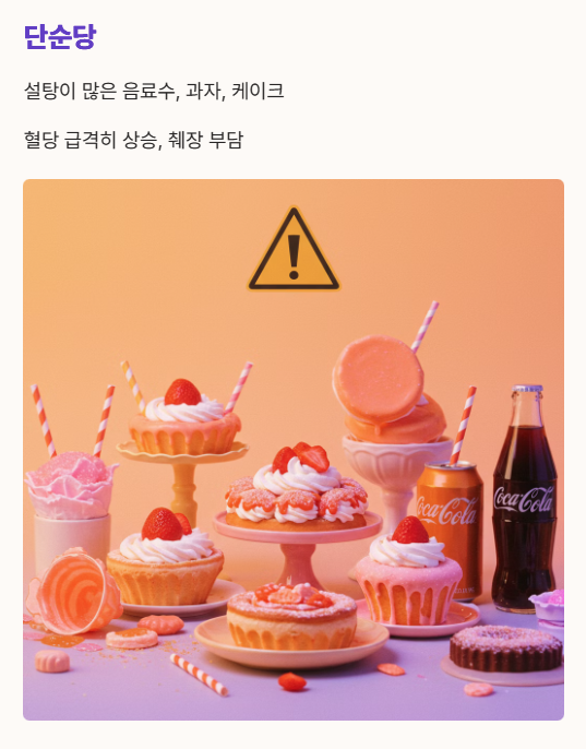 - 설탕이 많이 든 음료수, 과자, 케이크 등은 혈당을 급격히 올려 췌장을 지치게 만들어요. 🍰