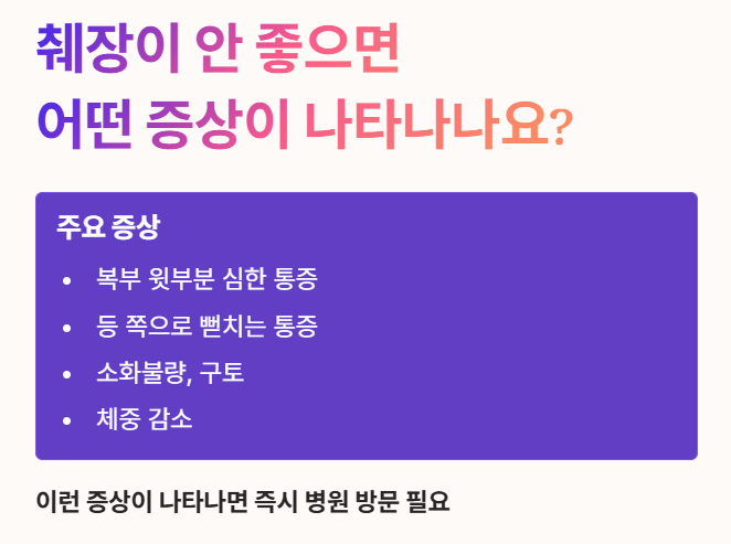 - A: 대표적인 증상으로는 복부 윗부분의 심한 통증, 등 쪽으로 뻗치는 통증, 소화불량, 구토, 체중 감소 등이 있어요.