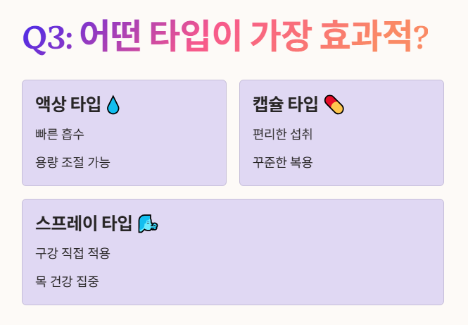 Q3: 액상, 캡슐, 스프레이 타입 중 어떤 게 가장 효과적인가요?