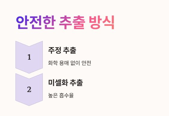 - 이때 화학적인 용매를 사용하지 않은 '주정 추출 방식'이나 '미셀화 추출 방식'으로 만든 제품이 안전하고 흡수율도 높으니 참고하세요.