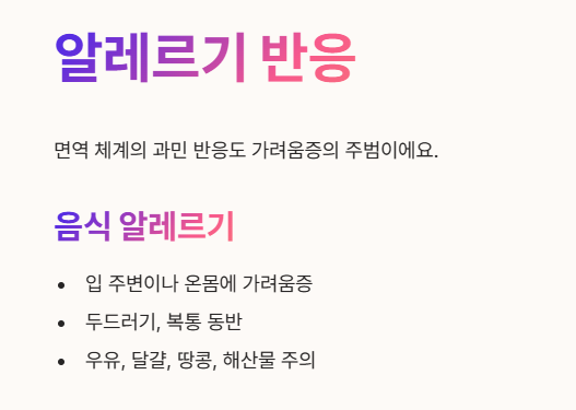 - 관리 방법: 원인이 되는 물질을 정확히 파악하고 피하는 것이 가장 중요해요. 병원에서 알레르기 검사를 통해 원인 물질(항원)을 찾는 것이 도움이 될 수 있습니다. ✅