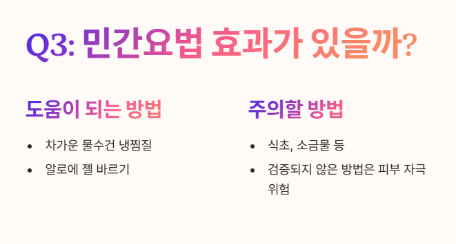 - 하지만 과학적으로 검증되지 않은 민간요법(식초, 소금물 등)은 피부를 자극해 상태를 악화시킬 수 있으니 주의해야 합니다.