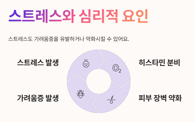 - 신경 전달 물질: 스트레스를 받으면 우리 몸에서 히스타민과 같은 가려움증을 유발하는 신경 전달 물질이 분비돼요.