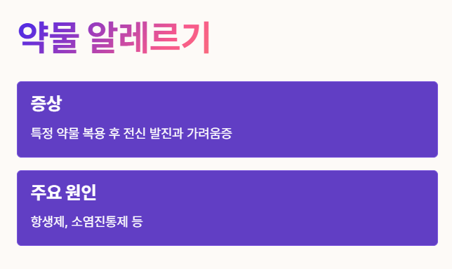 - 약물 알레르기: 특정 약물을 복용했을 때 전신에 발진과 가려움증이 생길 수 있어요. 항생제나 소염진통제 등에 의해 나타나는 경우가 많답니다. 💊