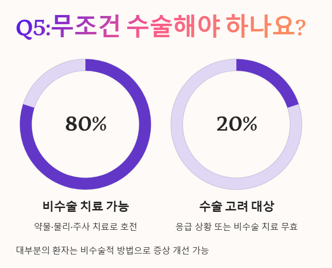 - 수술은 대소변 장애 등 응급 상황이나, 비수술 치료에도 효과가 없는 경우에만 고려합니다.