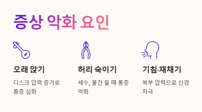 - 기침이나 재채기할 때: 순간적으로 복부 압력이 높아져 신경을 자극해요.