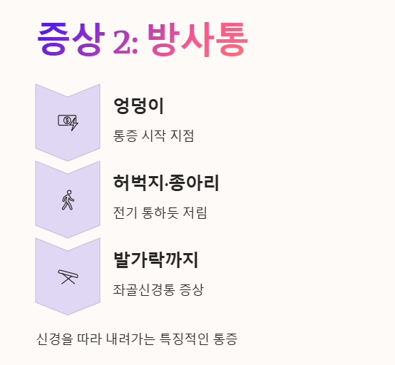 - 허리디스크가 신경을 누르면서, 엉덩이부터 허벅지, 종아리, 심지어 발가락까지 전기가 통하듯 저리고 아픈 증상이에요. ⚡