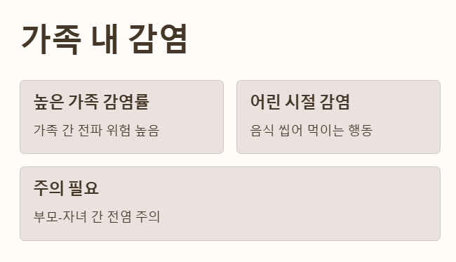 - 가장 강력하게 의심되는 헬리코박터균 원인은 바로 '사람 간의 전염'이에요.