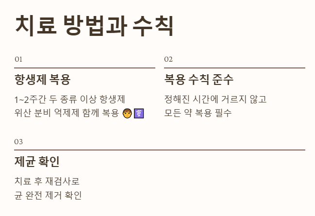 - 항생제 및 위산 억제제: 보통 1~2주간 두 종류 이상의 항생제와 위산 분비 억제제를 함께 복용해요. 🧑⚕️