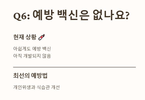 - 아쉽게도 현재까지 헬리코박터균을 예방하는 백신은 개발되지 않았어요. 💉