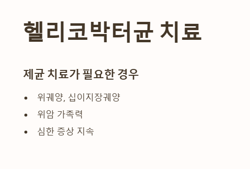 - 하지만 위궤양, 십이지장궤양 환자, 위암 가족력이 있는 경우 등은 재발 방지 및 예방을 위해 제균 치료를 강력히 권장합니다. 🧑⚕️