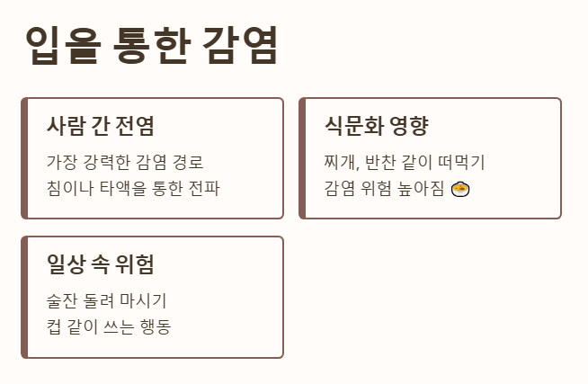 - 특히 한국처럼 찌개나 반찬을 같이 떠먹는 식문화에서는 감염 위험이 높아요. 🍲