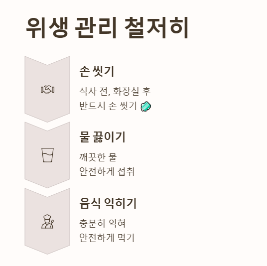 - 음식을 먹기 전이나 화장실 사용 후에는 반드시 손을 깨끗이 씻으세요. 🧼